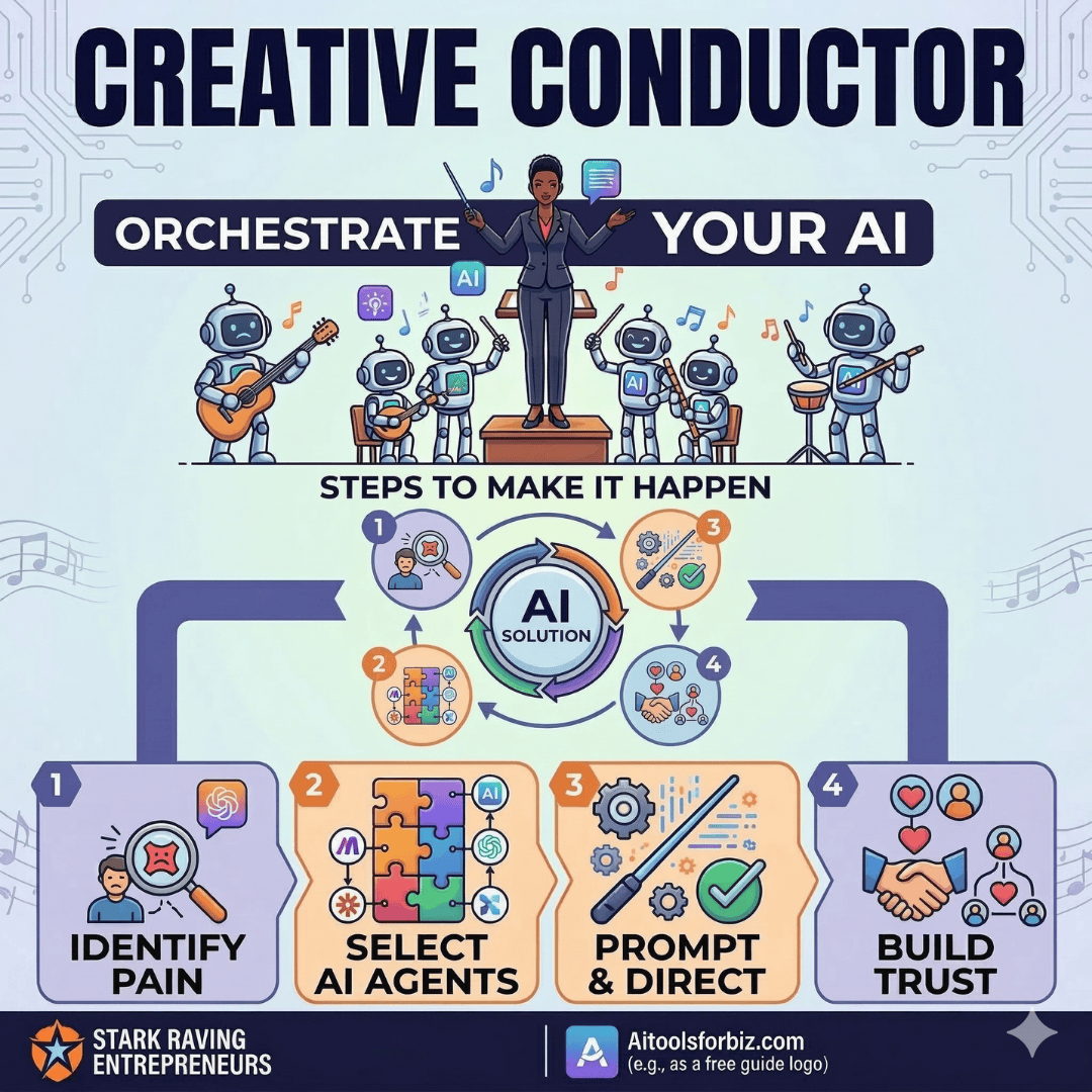 In this guide, we are going to explore how to move beyond being “just” a content creator and step into a role that gives you a massive competitive advantage: The Creative Conductor. This concept, popularized by Terry Brock at Stark Raving Entrepreneurs, is about orchestrating Artificial Intelligence to solve real-world problems. By the end of this post, you will understand how to position yourself at the center of your own AI orchestra, allowing you to build a high-value business without the burnout.